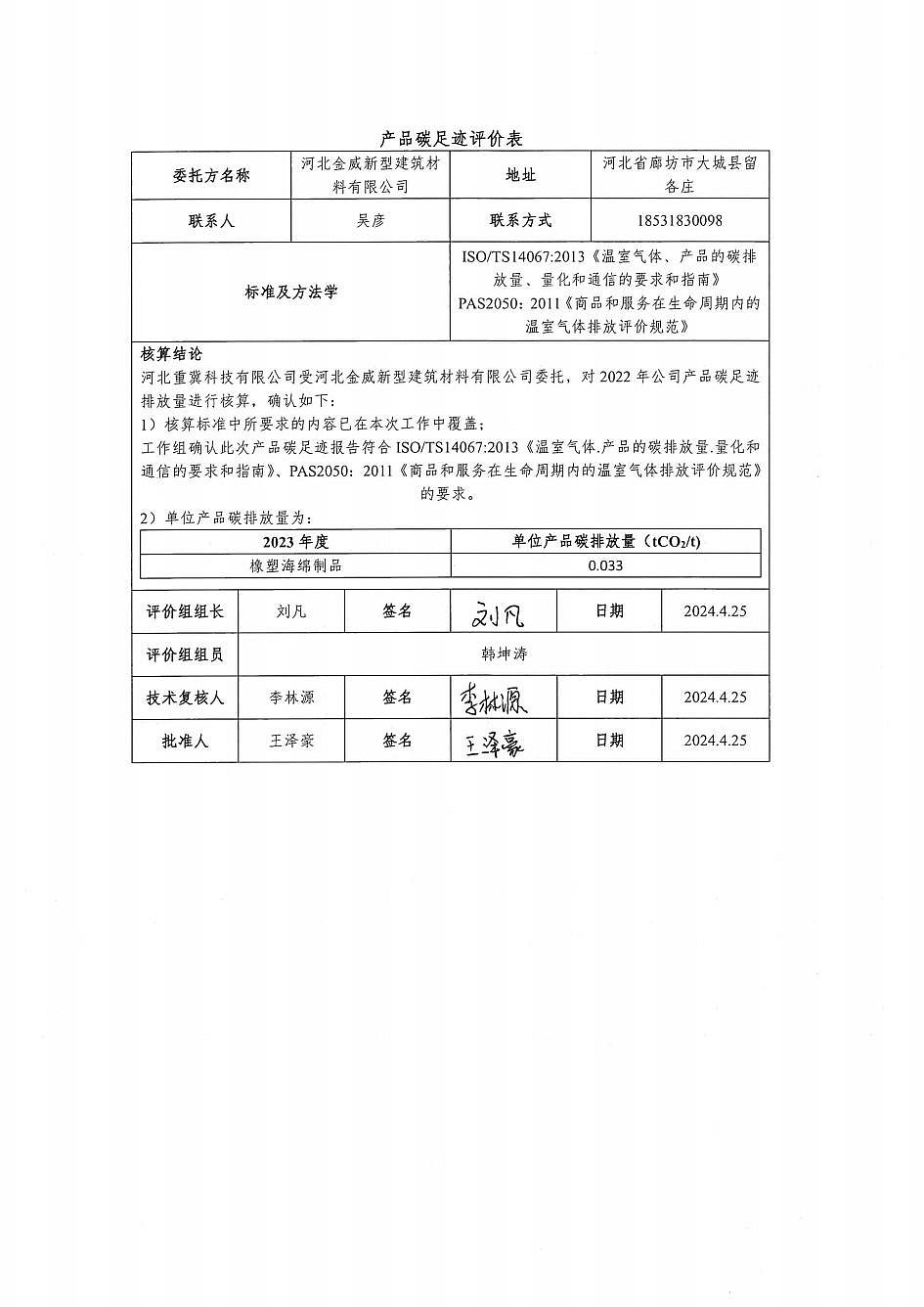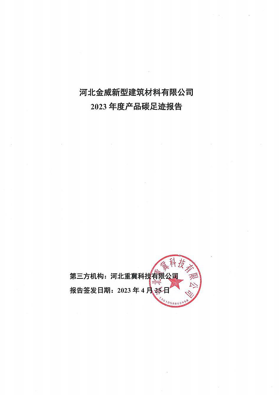 河北金威新型建筑材料有限公司2023年度產(chǎn)品碳足跡報告