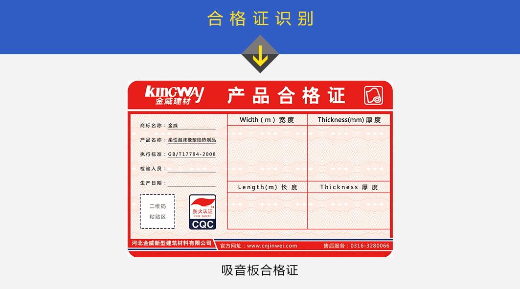 一、"金威"牌吸音降噪系列產(chǎn)品每件包裝上都貼有本公司統(tǒng)一打印的合格證,發(fā)貨時(shí)并打印銷售人員二維碼,發(fā)貨日期與檢驗(yàn)人員編號(hào)。